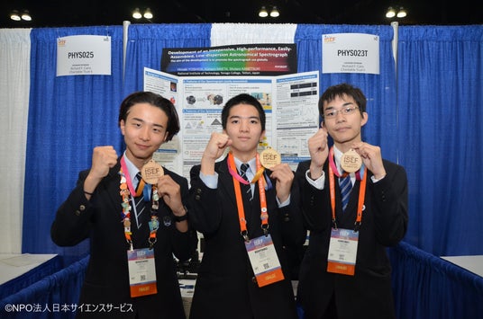 物理学・天文学部門 優秀賞4等を受賞した吉田浩瑛さん、前田孝太朗さん、鐘築昇太郎さん