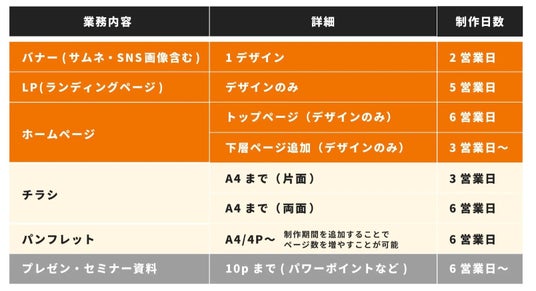 1番人気のバナー(サムネ、SNS等のアイキャッチ画像を含む)は1デザインで2営業日、両面の名刺は3営業日以内、スマホサイトのトップページ(デザインのみ)も最短6営業日で制作します。詳細は、ホームページでチェックできます。