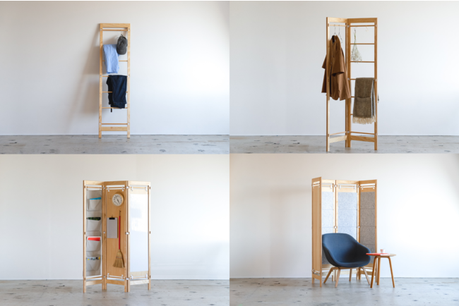 フレームは「ハンガー」 「ラダー」 「ホワイトボード」 「帆布ポケット」 「ミラー」 「吸音ボード」 「有孔ボード」の7種類を用意。 連結部分には馴染みのある面ファスナーを採用したことで、手軽な組み合わせを実現しています。1枚のフレームを壁に立てかけてラダーラッ クとして使ったり、2枚~4枚のフレームを連結してハンガーラックにしてみたり、パ ーテーションと収納性を兼ね備えた仕事スペースをつくったり、 吸音ボードで周囲を囲 って一人時間を楽しんだり、 とロケーションによってデザインを変更することができます。 使い方を限定しない柔軟な家具は、生活の幅をより広くしてくれます。