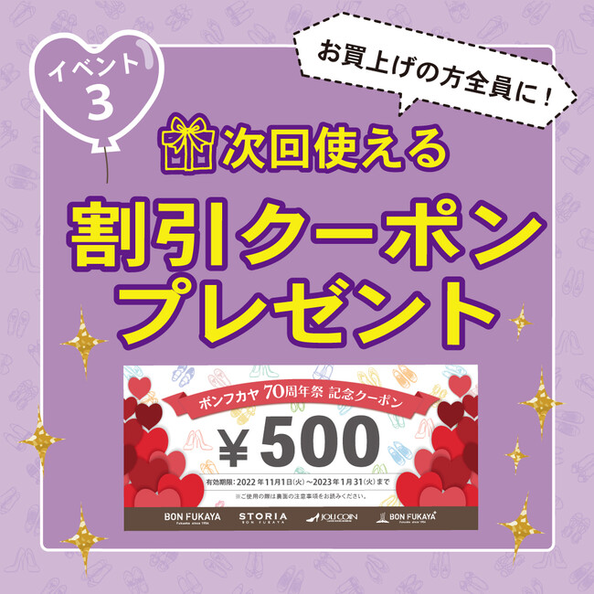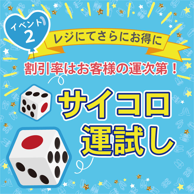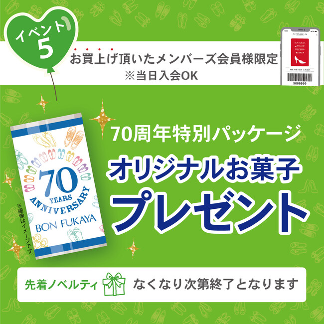 九州各地に展開している靴屋「BON FUKAYA(ボンフカヤ)」の各店舖では、期間中の店内をバルーンで華やかに演出し、割引額をお客様自身で決める「サイコロ運試し」や最大70%OFFになる「ありがとうプライスコーナー」など、前回よりもっとお得にお楽しみいただける『5つの特別イベント』をご用意して皆様のご来店をお待ちしております。