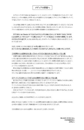 2016年9月設立。「楽しんだって、いい」を企業理念とし、正解を追求するHOWではなく、心の感動に従うWOW!を追求し、「楽しい国、日本」の実現を目指すアートカンパニー。オフィスアートやオーダーアートの企画制作、東京都目黒区にてアートのセレクトショップ「OVER ALLs STORE」を運営。主に代表の赤澤岳人が企画•プロデュースを担当。メインアーティストである画家山本勇気は「ART BATTLE JAPAN 2018」チャンピオン。