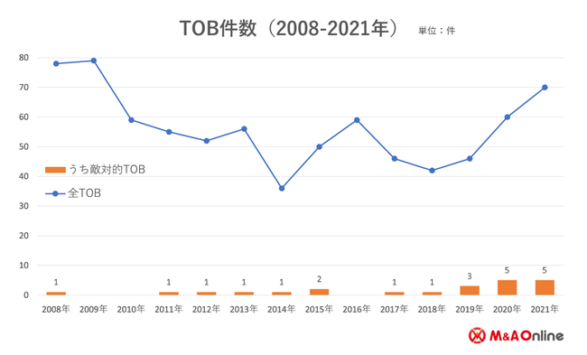 ・2021年に実施された株式公開買い付け(TOB)は70件(※自社株買いを除く)と2009年(79件)以来の高水準となった。TOB件数を押し上げた要因はMBO(経営陣による買収)。MBO件数は19件と2020年(11件)から倍増した。