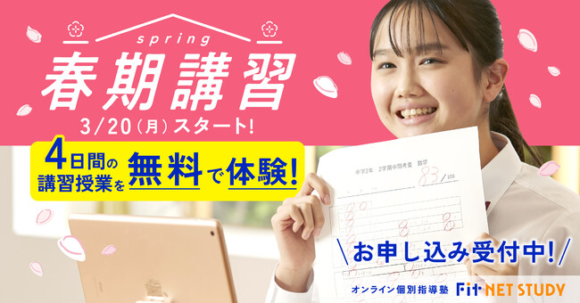 全国に学習塾を展開しているCKCネットワーク株式会社(取締役代表:山崎朋宏、本社:愛知県名古屋市中区)が運営しているオンライン個別指導塾「Fit NET STUDY(フィットネットスタディ)」の春期講習が3月20日(月)よりスタートします。