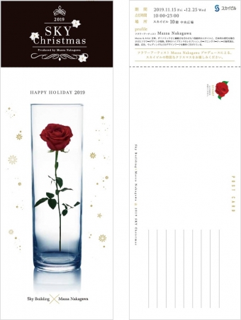 開催期間中は、スカイビル館内にお持ち帰り自由の『SKY Christmas 2019』のポストカードをご用意しています。シリンダーに収められたバラをデザインし、タイトル部分を切り取りとって頂ければクリスマスシーズンに相応しいポストカードとしてもお使いになれます。