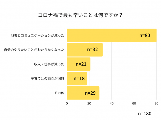 コロナ禍で最も辛いことについて質問したところ、1位「他者とのコミュニケーションが減った(n=80)」、2位「自分のやりたいことがわからなくなった(n=32)」となりました。それ以外で特に多かったのが、「子連れで在宅勤務は不可能」「子どもの勉強や家事など1人何役もこなすことに限界を感じる」(自由回答)といった声でした。在宅勤務の導入が進み、仕事とプライベートがかつてないほど一体化した中で、悩みや葛藤を他者に相談する環境・機会が減っていることがこれらの要因と考えられます。