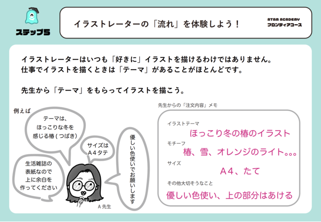 「イラストレーターになりきろう!」の授業は、イラストレーターの仕事をプチ体験できるカリキュラムです。実際のイラストレーターは発注者の注文通りにイラストを描きますが、ただ言われた通りに描くだけではイラストレーターとして活躍できません。個性のないイラストレーターは仕事が減っていきます。