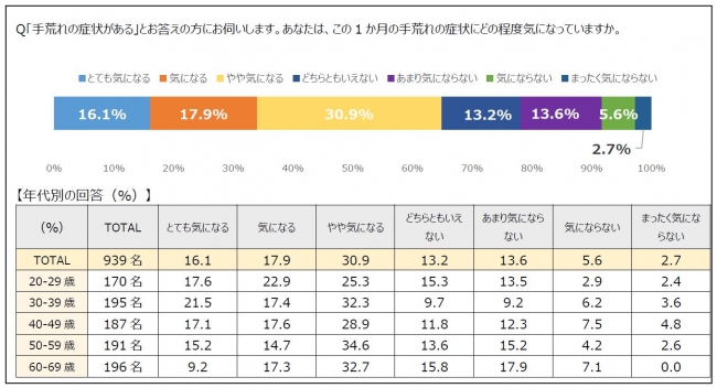 また、手荒れの症状があると回答した方に、この1か月の手荒れの症状がどの程度気になっているか尋ねたところ、「とても気になる」(16.1%)「気になる」(17.9%)「やや気になる」(30.9%)を合わせると、