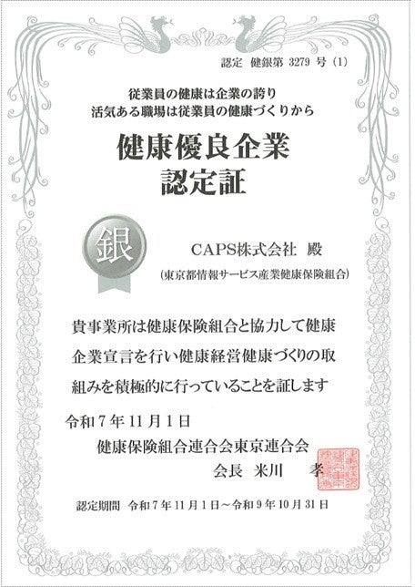 CAPS株式会社(本社:東京都港区、グループ代表:鶴谷 武親、以下「CAPS」)は、健保連合東京連合会より、2025年11月1日付で健康優良企業「銀の認定」に2年連続で更新認定されました。