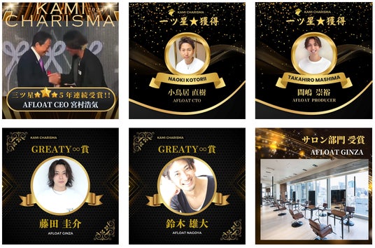 今回AFLOATでは、6タイトルを受賞いたしました。代表の宮村は、11名という狭き門でもある三ツ星美容師に5年連続で選出されております。