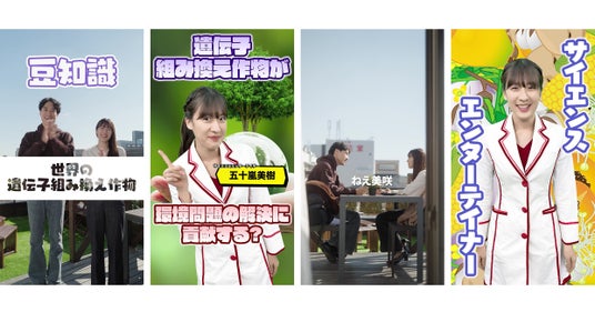 ショートドラマ『仁義なき戦い 新婚旅行計画篇』では五十嵐さんがドラマに初挑戦。夫婦の新婚旅行をめぐる会話の中で遺伝子組み換え技術の海外の事例や研究エピソードについて紹介しています。