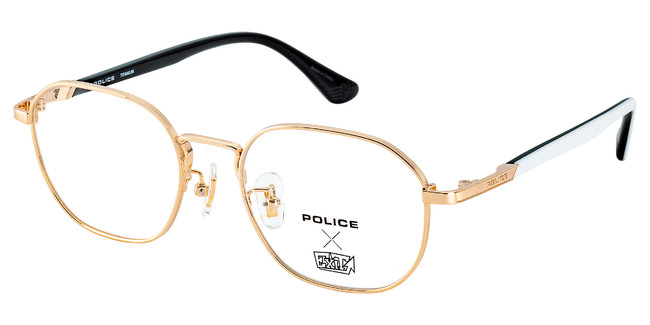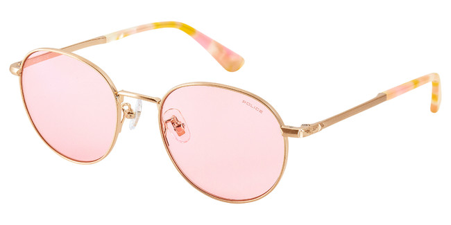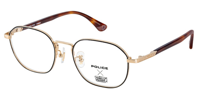 ラウンドに近いボストンタイプのフロントシェイプに、ライトカラーのレンズをオン。りんたろー。モデルはアンティークゴールドに落ち着いたグリーンのレンズ、兼近モデルはゴールドのフレームに髪色をイメージしたピンクのレンズを選択しました。フレームサイドにはブランドのイメージアイコンであるイーグルロゴを載せPOLICEらしさも表現。