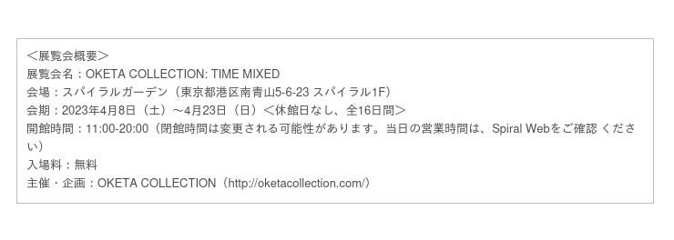 室町時代の骨董美術からデジタルアートまで、桶田コレクション作品が一堂に会した展覧会「OKETA COLLECTION: TIME MIXED」が、スパイラルガーデンで2023年4月8日(土)~4月23日(日)の期間で開催されます。