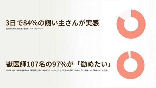 ※2:2020年10月、製品使用実績のある獣医師から無作為抽出した107名のアンケート調査の結果、104名が「ぜひ薦めたい」「薦めたい」と回答、メーカー調査
