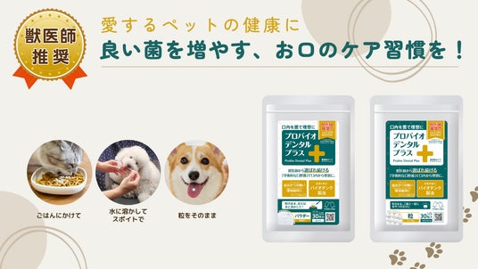 そこで注目されているのが、ペットの「口腔内の菌バランス」を整える新しいケアの考え方。従来の「殺菌して清潔に保つ」というアプローチから一歩進み、サプリメントで善玉菌を補給して口内の悪玉菌が活動しづらい菌バランスに整えることで、口腔環境を健康に保つ手法です。動物医療の現場や専門家だけでなく情報感度の高い飼い主さんの間では、すでに高い評価を受けています。