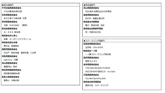 2020年には、日本酒部門増設。176アイテムが出品。うち日本ワインが50アイテム(赤21アイテム、白25アイテム、スパークリング4アイテム)、日本リキュールが30アイテムの出品。日本酒が96アイテム(うち純米大吟酒31、純米吟醸酒23、純米酒23、熟成酒7、スパークリン酒12)が出品。56アイテムが入賞。