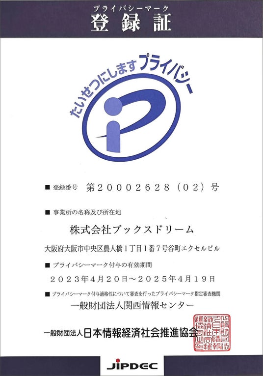 株式会社ブックスドリーム(本社:大阪府大阪市、代表取締役:井上聖也)では、お客様の個人情報の適切な保護管理体制を構築し、安心してご利用いただくため、弊社の個人情報の保護管理体制が、日本産業規格「JIS Q 15001 個人情報保護マネジメントシステム-要求事項」及び「個人情報保護法はじめ個人情報保護に関する各種法制度」に適合していることの証明である「プライバシーマーク」を取得しております。