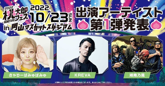 2022年10月23日(日)、倉敷スポーツ公園・マスカットスタジアム(〒710-0016 岡山県倉敷市中庄3250-1)にて開催される『桃太郎フェス 2022』の第一弾メインステージ出演アーティストとして、きゃりーぱみゅぱみゅ、KREVA、湘南乃風(※50音順)の3アーティストが決定!さらに8/3(水)18:00からは公式HPでチケット先行販売を開始いたします。『桃太郎フェス 2022』は、岡山県内で行われる音楽フェスとしては最大級のイベントで、エンターテイメントを通じて岡山から日本中に元気をお届けします。