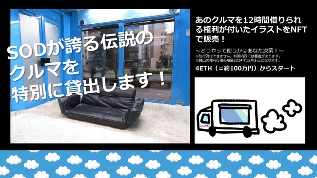 本企画では、「伝説のあのクルマ」をNFTの購入者様にドライバー付きでお貸出しするという前代未聞の商品です。購入したお客様は借りる日程と使用内容をスタッフと相談いただき、例えば伝説のあのクルマで寝たい、とか、自社のイベント会場に設置したい、とか、部屋に友人を招待してパーティーを開きたい、といった企画を実現することができます。ぜひ本NFTをゲットしていただき、貴重な体験をお楽しみください。