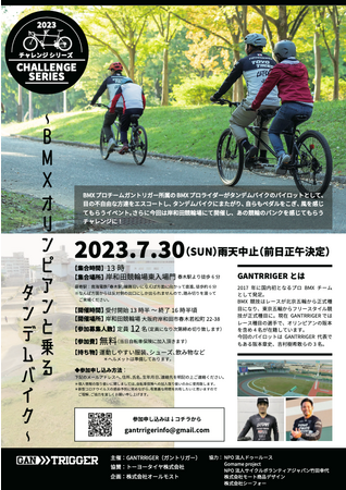 プロBMXチームGANTRIGGER(運営:株式会社GANalliance)は、視覚障害者の方々へ向けたタンデムバイクイベント『2023チャレンジシリーズ』を7月30日(日)に岸和田競輪場にて開催致します。