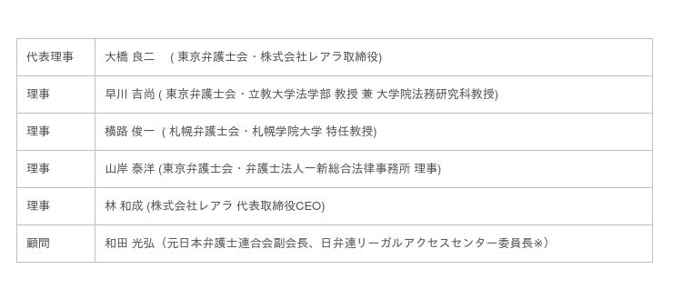 代表理事:大橋 良二 (東京弁護士会・株式会社レアラ取締役)