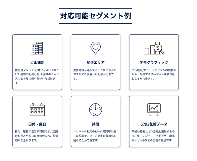 対してエレベータ広告は、柔軟なコスト設定で詳細かつ精度の高いターゲティングが可能な広告手法です。代理店パートナーと連携をしていくことでエレベータ広告の可能性を知っていただく機会を増やし、より多くの企業の事業成長をサポートいたします。