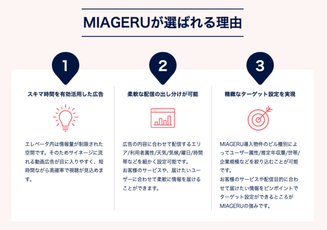 MIAGERUはエレベータ内に設置されたモニターでお客様の商品を動画広告で配信し、売上向上をサポートします。モニターは商業施設・マンション・オフィスビルなど、都内206か所に既に設置されています。エレベーター広告は特定の居住者、在勤者と利用者が複数回利用するため、高い認知拡大性とリマインド効果が見込まれ、近年注目を集めています。