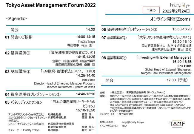 2022年2月24日、Tokyo Asset Management Forum 2022(TAMF2022)を開催いたします。本セミナーでは、新興資産運用者を中心に、新鋭多様な国内外の資産運用者のプレゼンテーションを紹介し、また、Teacher Retirement System of Texas, Norges Bank Investment Management, 国立研究法人 科学技術振興機構といったアセットオーナーによる講演や、国内有数の運用会社によるパネルディスカッション等を予定しています。少子高齢化等の社会課題を有する日本においては、資産運用業の高度化・多様化の必要性が高まっています。皆様ふるってお申込みいただければ幸いです。