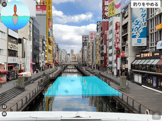 観光名所である戎橋の上から、道頓堀川に向かってスマホをかざすとAR釣りゲームを体験することができます。
