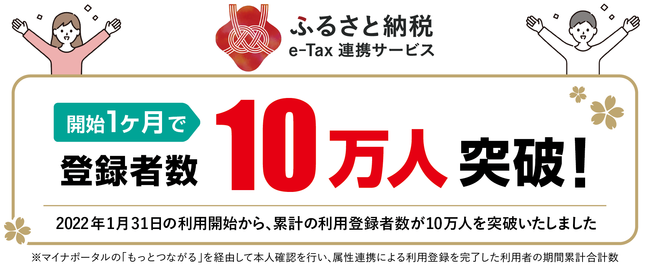 株式会社シフトセブンコンサルティング(以下、シフトセブン、本社:福岡県福岡市中央区、代表取締役社長:井本憲史)は、ふるさと納税の寄附金控除の証明書データを生成し、ペーパーレスを実現するサービス「ふるさと納税e-Tax連携サービス」(以下、本サービス)において、2022年1月31日の提供開始から約1ヶ月(2022年3月2日時点)で、登録者数が10万人を突破したことをお知らせ致します。