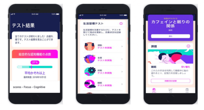 本サービスでは、目の動きから認知機能の状態を把握するテストを含む複数の臨床研究に基づいた認知機能チェックテストを行います。同時に認知機能低下に影響を与える「食生活・運動・睡眠・リラックス(ストレス管理)・脳のトレーニング・交友関係」の6つの生活習慣について質問をします。その結果から、自身に適した改善項目を提案し、改善を促していくプログラムです。科学的な観点で早期発見から改善までをトータルで支援し、 かつスマートフォンで手軽に利用することができます。