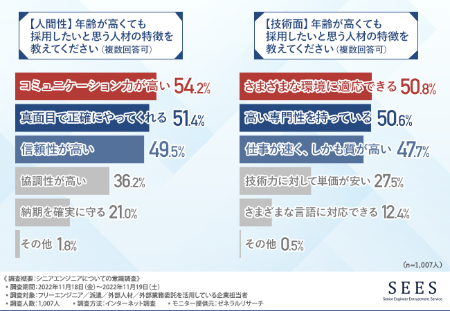シニアエンジニアに対して求めていることは、昨年の調査と同様、シニアならではの経験や知識、技術力を評価する声が高いようですが、異なる点は「コミュニケーション能力」や「適応力」といったパーソナルスキルを重視する傾向も見られたことです。