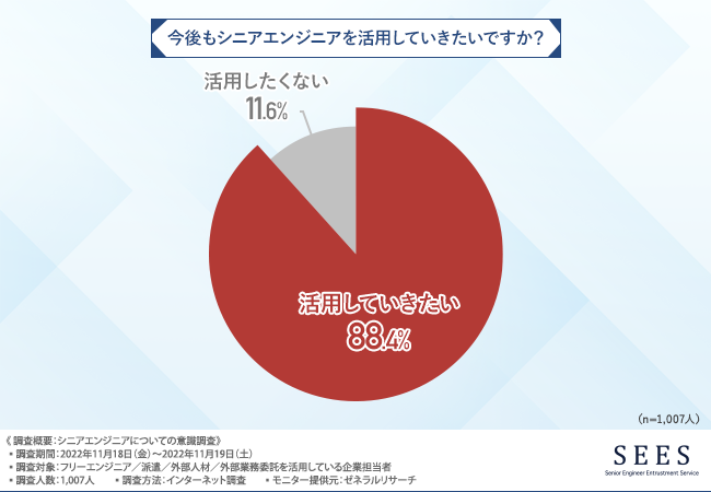 そこで、「今後もシニアエンジニアを活用していきたいですか?」と質問したところ、9割近くの方が『活用していきたい(88.4%)』と回答しました。