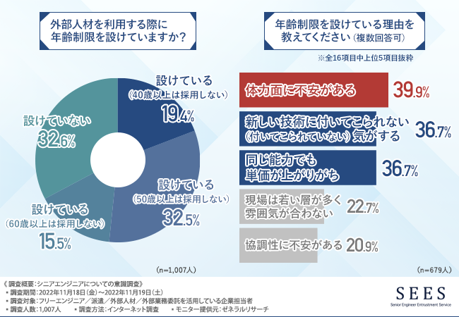 昨年実施した、「シニアエンジニアについての意識調査」(https://prtimes.jp/main/html/rd/p/000000004.000052102.html)では、外部人材を採用する際、「年齢制限を設けている」と回答した企業担当者の割合は46.3%(設けていると回答した割合の合計)でした。