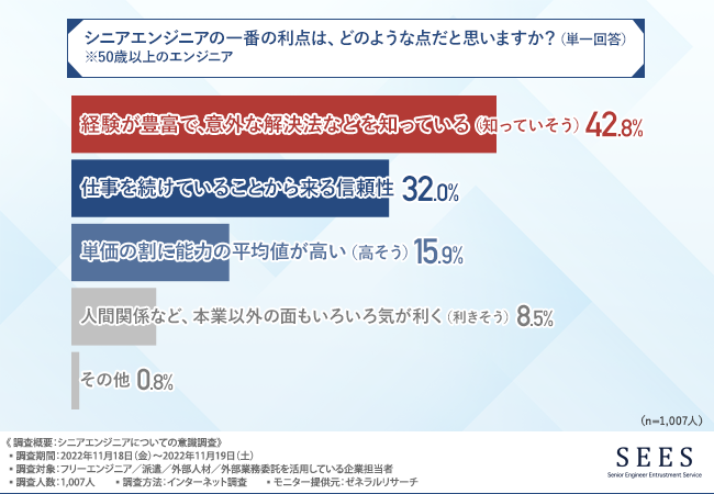 そこで、「シニアエンジニア※の一番の利点は、どのような点だと思いますか?(単一回答)※50歳以上のエンジニア」と質問したところ、『経験が豊富で、意外な解決法などを知っている(知っていそう)(42.8%)』と回答した方が最も多く、次いで『仕事を続けていることから来る信頼性(32.0%)』『単価の割に能力の平均値が高い(高そう)(15.9%)』『人間関係など、本業以外の面もいろいろ気が利く(利きそう)(8.5%)』と続きました。