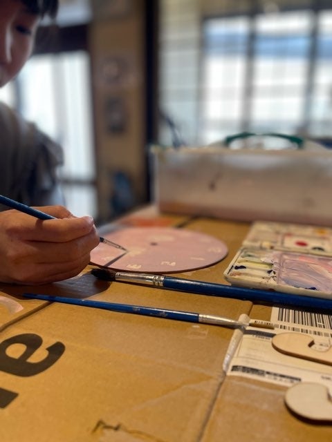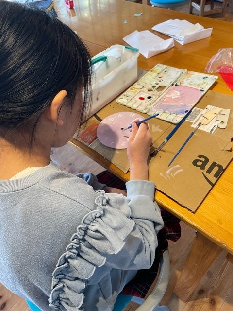 オリジナルの時計作りのワークショップ。時計板の制作に夢中な生徒の様子。