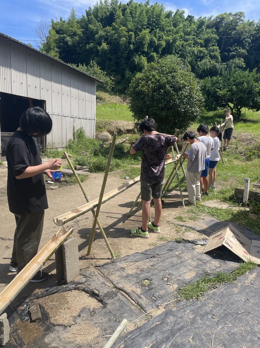 【自由参加のイベント】児童生徒の興味範囲を広げるきっかけとなるように様々なイベントが毎月開催されます。写真は流しそうめん大会のイベントの様子です。大人が極力介入せずに、児童生徒がやりたいようにやりたいだけやってもらう方針です。裏にある山から竹を切り運びして、もの凄く長い流しそうめん台の製作に夢中の児童生徒の様子です。(裏山は天神山古墳で、山頂には学問の神様、菅原道真が祀られた神社があります。)