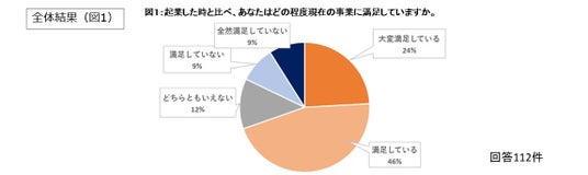 1.全体: 調査に協力した関西スタートアップのうち、70%は起業した時と比べて現在の事業に満足と回答しました。スタートアップの「成功」の定義は様々で、個人の価値観や期待値によっても異なります。これらの観点から、起業時と比べた現在の満足度について質問しました。困難も多い起業について、多くの経営者は不満や不安を持っているのではと予想していましたが、意外にも「大変満足している(24%)」「満足している(46%)」と70%が肯定的でした。自由回答からは肯定的な理由として、「事業の成長を実感している」「仲間や支援者が増えている」「自由に事業を進められる」「社会貢献の実感がある」などが挙げられました。一方、否定的な理由は、「まだ成し遂げられていないことが多い」「資金調達に苦戦している」「売り上げがまだ十分でない」などでした。