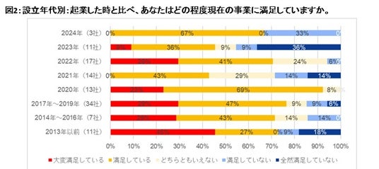 2.起業1-2年目では満足度が低い企業が他より多く、33%から45%に達しました。母数は少ないですが、設立年度で分けて満足度を見ると、2024年・2023年設立で「満足していない」「全然満足していない」の回答が多い傾向にありました。生態会では設立5年以内のスタートアップに取材をしていますが、この層は成長途上で、試行錯誤をしており、悩みながら事業を進めています。一方、2013年以前(設立10年以上)の企業でも、「満足していない」「全然満足していない」という回答が27%ありました。この結果を見て、生態会の副理事長の岩田進(イルグルム代表)は、「(自分は)上場してもなお満足していない。現状に満足していては成長がない。」と、貪欲であり続けたいといいます。