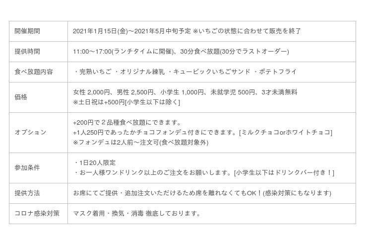 岡孝株式会社(代表:高橋 悠團、本社所在地:愛知県豊明市新田町吉池19-20)が運営する、恵比寿楽園テーブル(愛知県豊明市沓掛町東門26-2)、YR CAFE by恵比寿楽園テーブル(愛知県犬山市犬山東古券197-3)の両店舗で愛知県愛西市のいちご農園:あい愛ファーム、中野農園、久保農園(全て愛西市)にご協力いただき、農園直送の「完熟いちご食べ放題」を令和3年1月15日よりスタート。いちごマイスターに直接配送していただく[完熟いちご]の他、完熟いちごを使用し当店オリジナルクリームで挟んだ[キュービックいちごサンド]、お口直しに[ポテトフライ]が全て食べ放題(30分)でお楽しみいただけます。