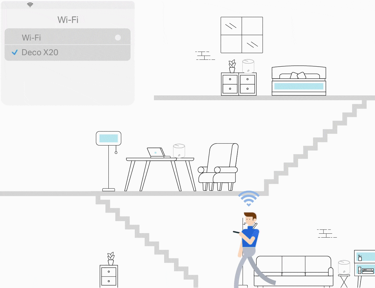 複数台の「Deco X20」が連携して構築したWi-Fiネットワークの中で、 「Deco X20」は最も速度が出るユニットを選定し、スマートフォンやタブレットを自動接続します‡ 。また、Wi-Fiネットワークは全て同じSSIDを使用しているため、テレビ電話の最中に別の部屋へ移動しても途切れる心配はありません。