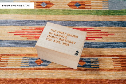 桐尊足オンラインストアのみのオプションで、箱蓋天面に15文字×4行までの英数字刻印が可能(フォント指定不可)です。我が子の名前や、初めて靴を履いた記念日など、ご要望に応じて刻印いたします。