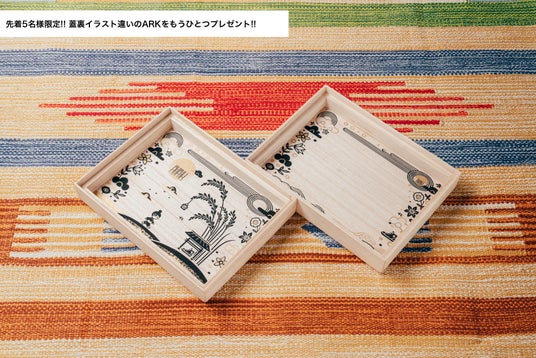 ARKの販売を記念して先着5名様に限り、ARKをもう一箱プレゼントします。プレゼントするARKは別パターンの蓋裏イラストを施しており、ファーストシューズを履いたお子様の足型をとったり、お子様に絵を描いてもらったり、ご自由に活用いただけます。