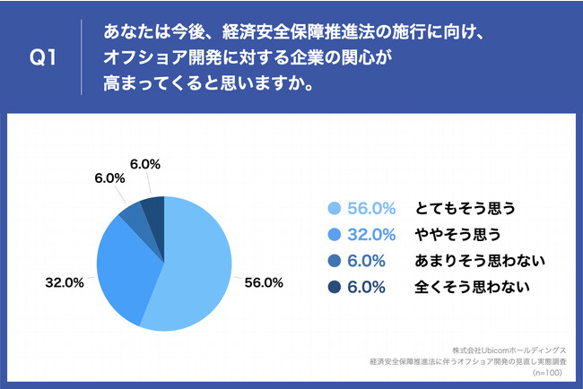 「Q1.あなたは今後、経済安全保障推進法の施行に向け、オフショア開発に対する企業の関心が高まってくると思いますか。」(n=100)と質問したところ、「とてもそう思う」が56.0%、「ややそう思う」が32.0%という回答となりました。