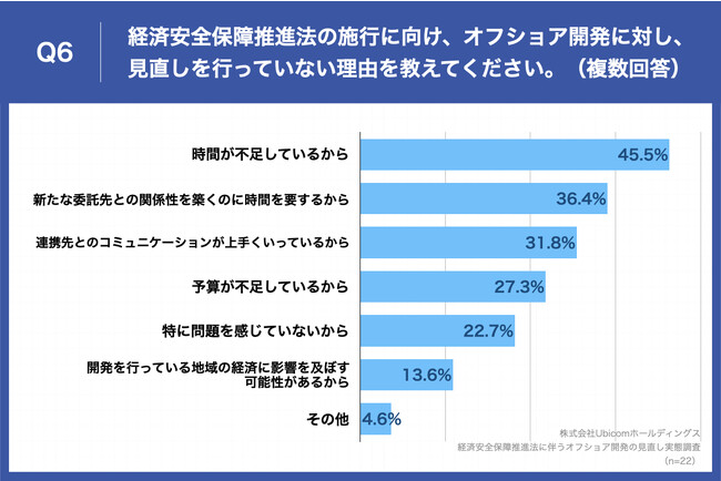Q3で「あまり行っていない」「一切行っていない」と回答した方に、「Q6.経済安全保障推進法の施行に向け、オフショア開発に対し、見直しを行っていない理由を教えてください。(複数回答)」(n=22)と質問したところ、「時間が不足しているから」が45.5%、「新たな委託先との関係性を築くのに時間を要するから」が36.4%、「連携先とのコミュニケーションが上手くいっているから」が31.8%という回答となりました。