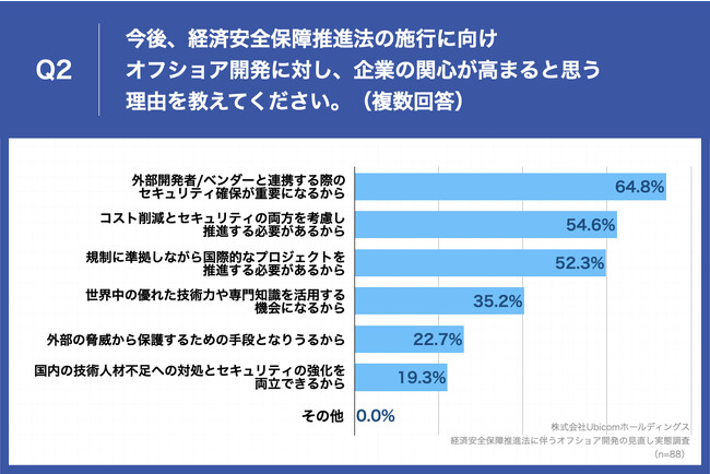 Q1で「とてもそう思う」「ややそう思う」と回答した方に、「Q2.今後、経済安全保障推進法の施行に向けオフショア開発に対し、企業の関心が高まると思う理由を教えてください。(複数回答) 」(n=88)と質問したところ、「外部開発者/ベンダーと連携する際のセキュリティ確保が重要になるから」が64.8%、「コスト削減とセキュリティの両方を考慮し推進する必要があるから」が54.6%、「規制に準拠しながら国際的なプロジェクトを推進する必要があるから」が52.3%という回答となりました。