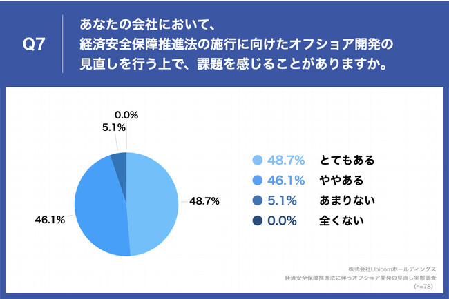 Q3で「積極的に行っている」「ある程度行っている」と回答した方に、「Q7.あなたの会社において、経済安全保障推進法の施行に向けたオフショア開発の見直しを行う上で、課題を感じることがありますか。」(n=78)と質問したところ、「とてもある」が48.7%、「ややある」が46.2%という回答となりました。