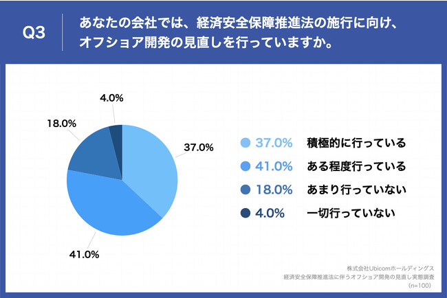 「Q3.あなたの会社では、経済安全保障推進法の施行に向け、オフショア開発の見直しを行っていますか。」(n=100)と質問したところ、「積極的に行っている」が37.0%、「ある程度行っている」が41.0%という回答となりました。