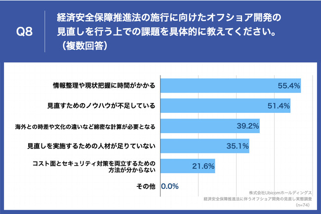 Q7で「とてもある」「ややある」と回答した方に、「Q8.経済安全保障推進法の施行に向けたオフショア開発の見直しを行う上での課題を具体的に教えてください。(複数回答)」(n=74)と質問したところ、「情報整理や現状把握に時間がかかる」が55.4%、「見直すためのノウハウが不足している」が51.4%、「海外との時差や文化の違いなど綿密な計算が必要となる」が39.2%という回答となりました。