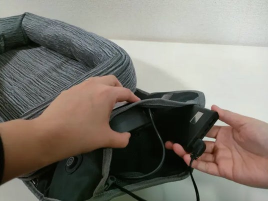 専用の大容量バッテリーが内蔵し、最大風量で9.5時間の稼働が可能で、1日のお出かけには十分な時間稼働します。コード類はシート内側のポケットに入っているので、コードがからまる心配もありません。