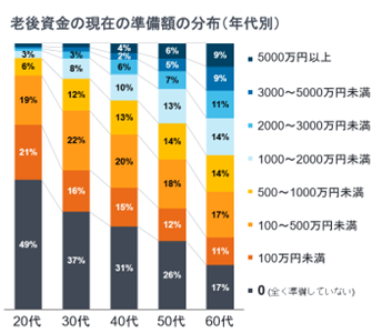 20代では約半数、30~40代でも3割強が、老後資金を全く準備していない(0円)と回答。